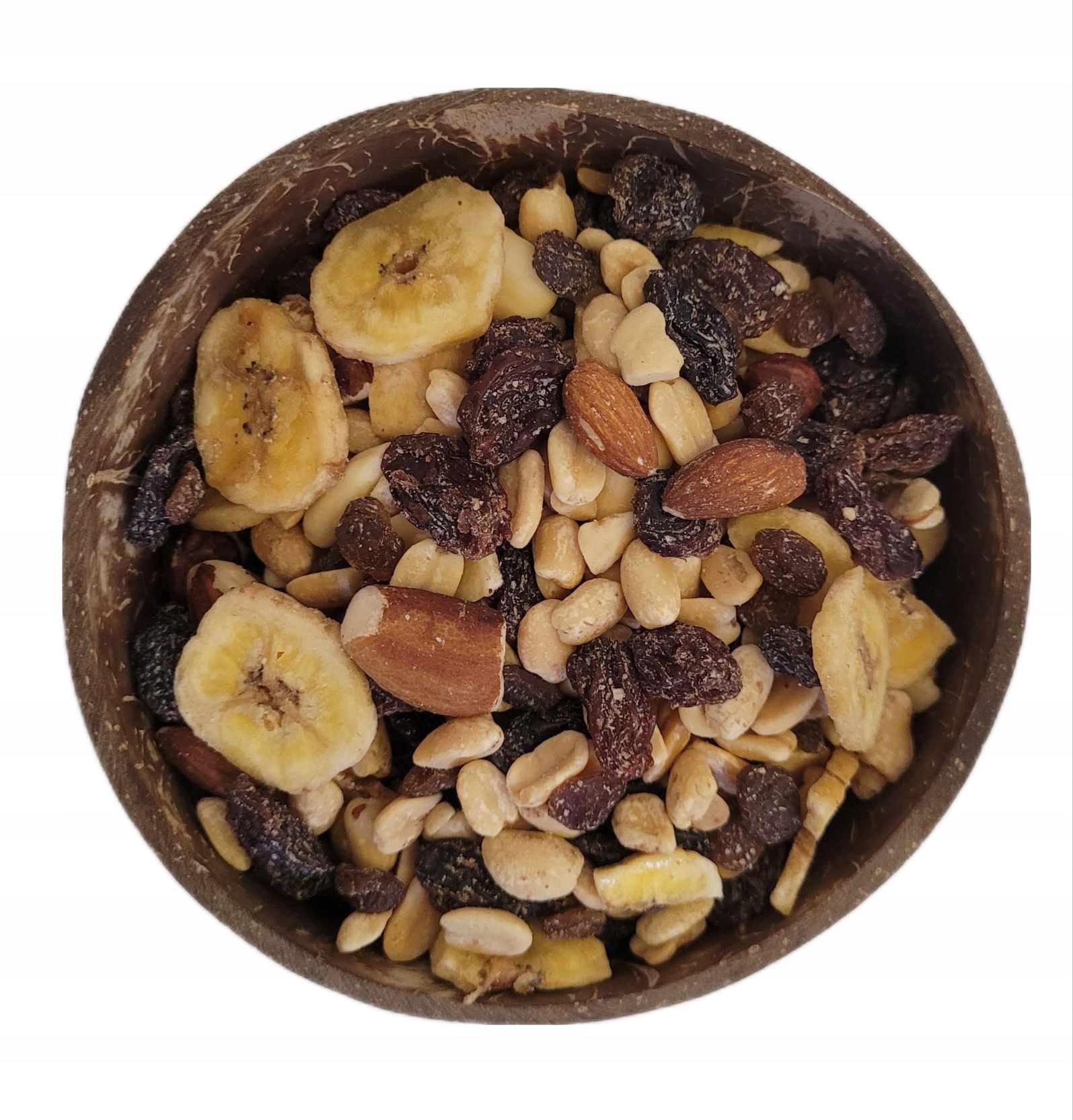 Składniki: orzech ziemny prażony, chipsy bananowe, rodzynka sułtańska, orzech nerkowca, migdał, orzech brazylijski, orzech włoski, orzech laskowy, migdał blanszowany